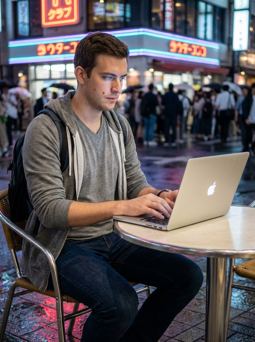 model as digital nomad in Tokyo at night with neon lights, working on laptop