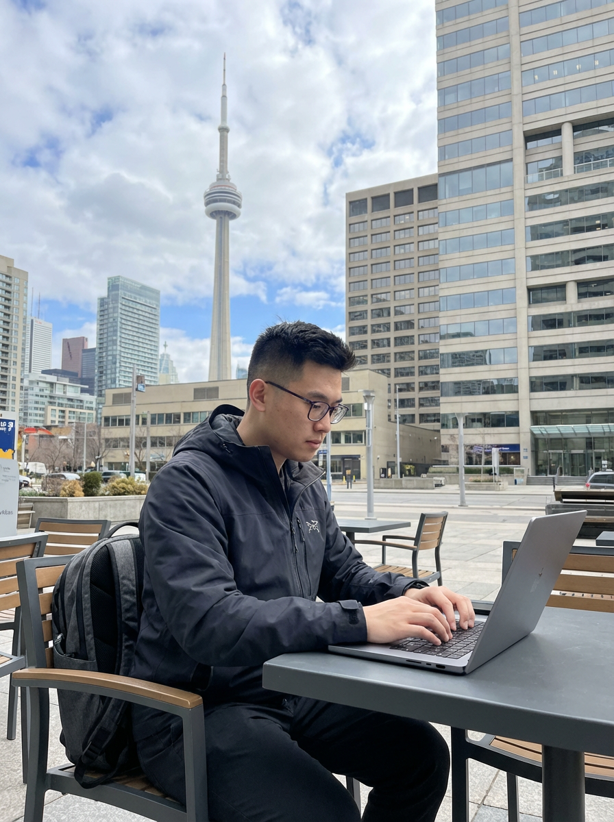 model as digital nomad in Toronto with the CN Tower in the background, working on laptop