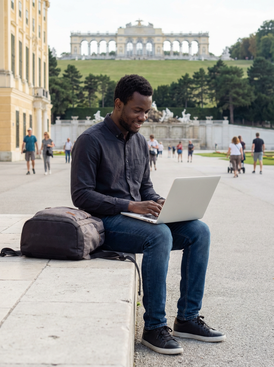 model as digital nomad in Vienna with the Schönbrunn Palace in the background, working on laptop