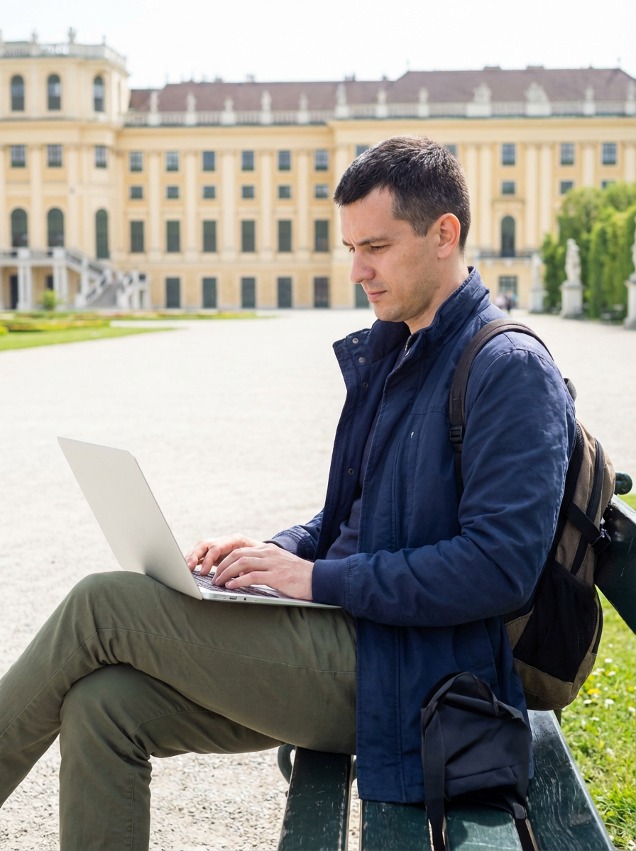model as digital nomad in Vienna with the Schönbrunn Palace in the background, working on laptop