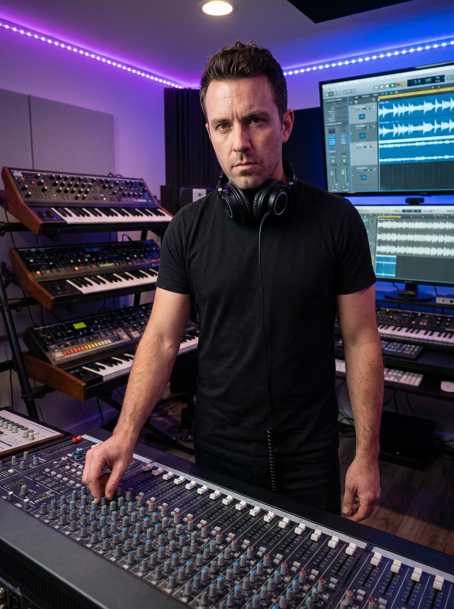 model as DJ producer, headphones around neck, electronic music aesthetic, studio equipment background