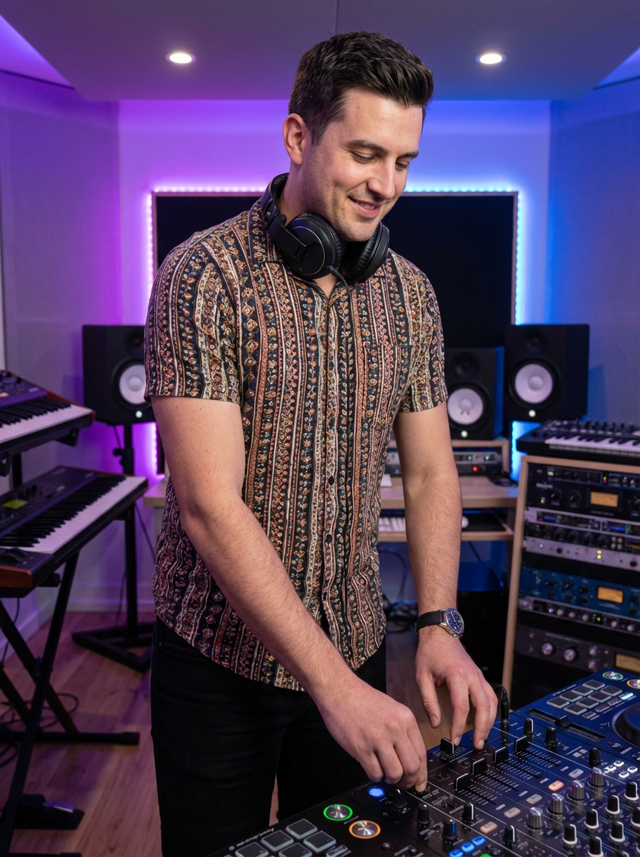 model as DJ producer, headphones around neck, electronic music aesthetic, studio equipment background