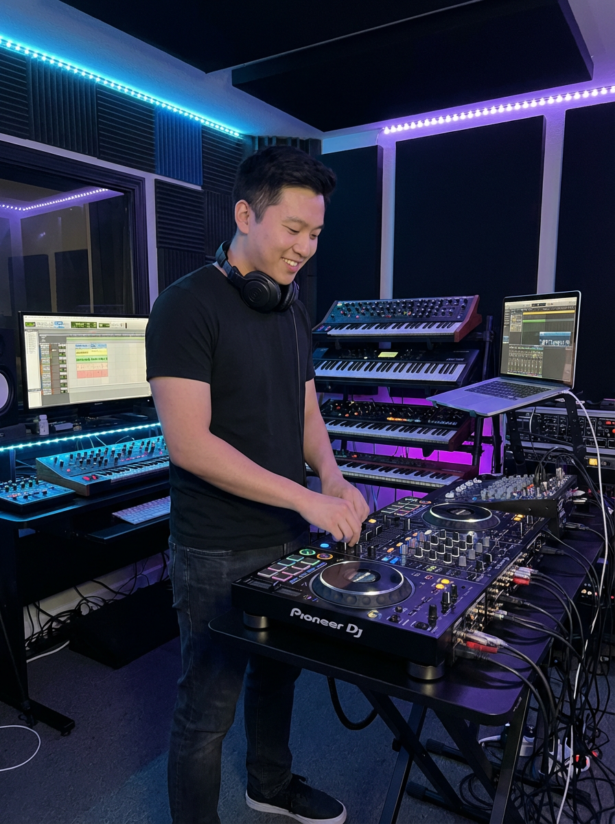 model as DJ producer, headphones around neck, electronic music aesthetic, studio equipment background