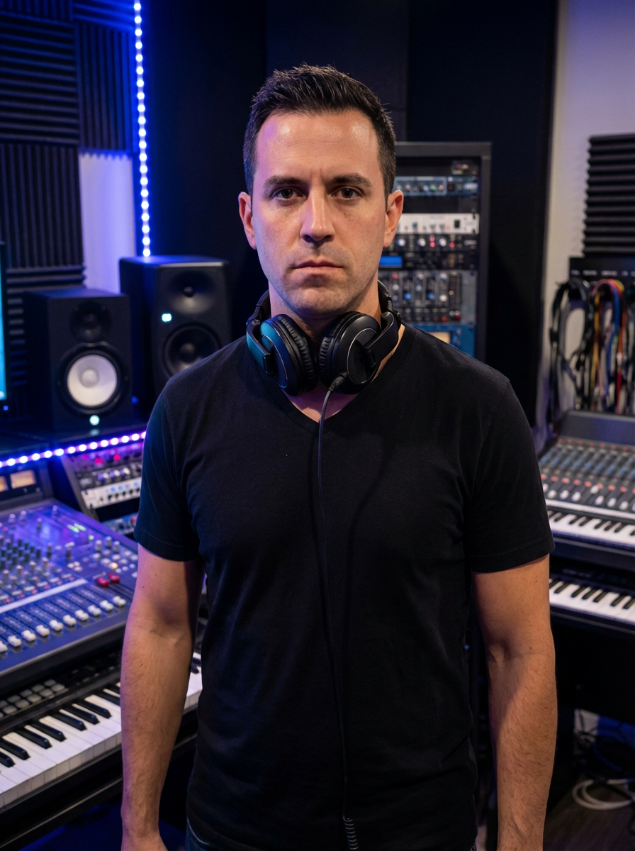 model as DJ producer, headphones around neck, electronic music aesthetic, studio equipment background