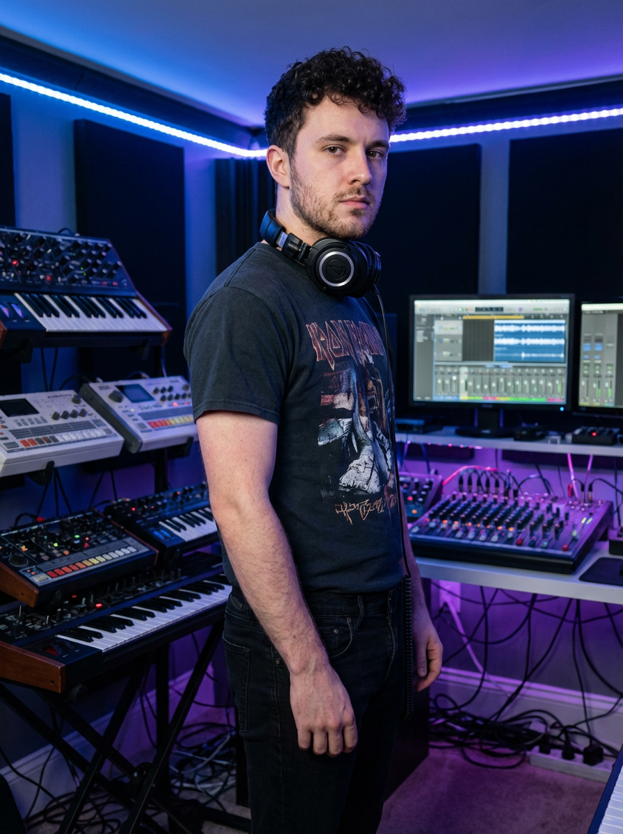 model as DJ producer, headphones around neck, electronic music aesthetic, studio equipment background