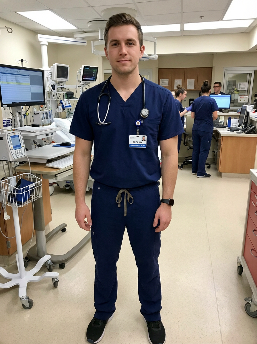 model as ER nurse, professional scrubs, calm confident expression, emergency department background