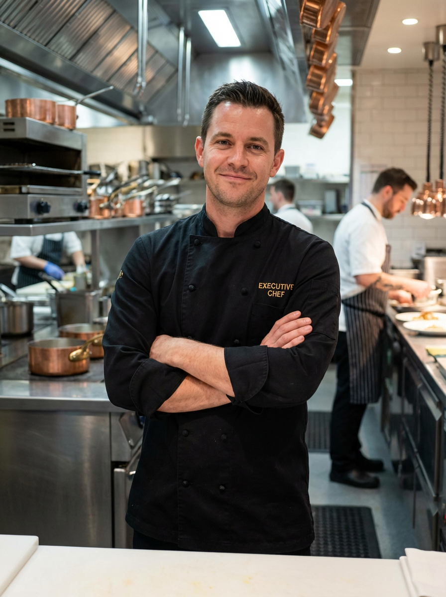 model as executive chef, black chef coat, arms crossed confident pose, upscale restaurant kitchen