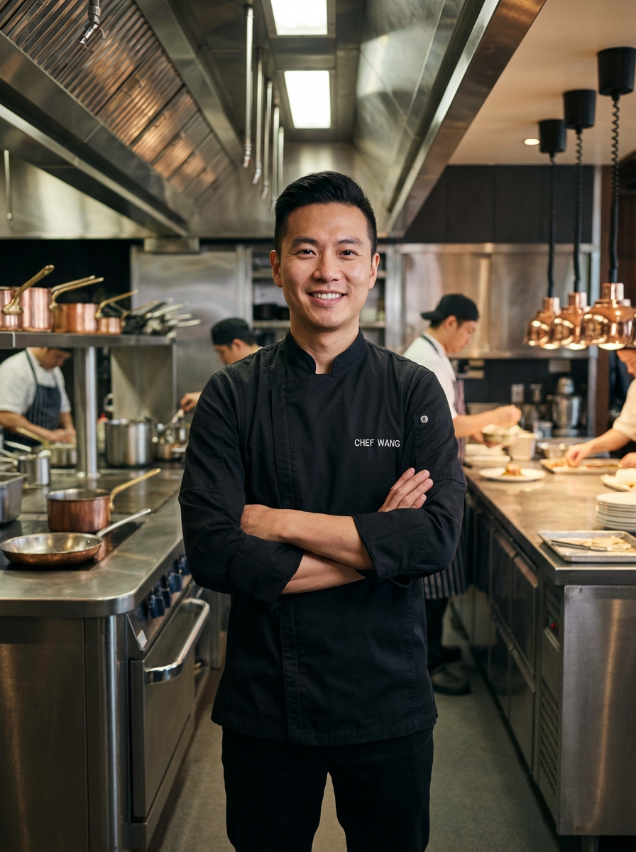 model as executive chef, black chef coat, arms crossed confident pose, upscale restaurant kitchen
