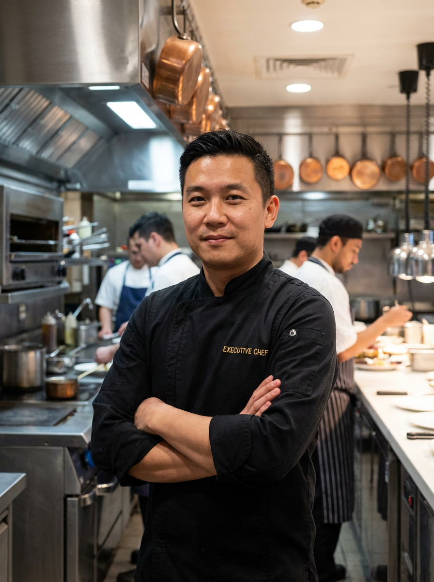 model as executive chef, black chef coat, arms crossed confident pose, upscale restaurant kitchen