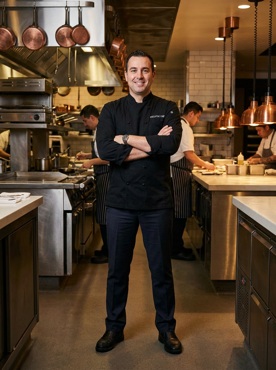 model as executive chef, black chef coat, arms crossed confident pose, upscale restaurant kitchen