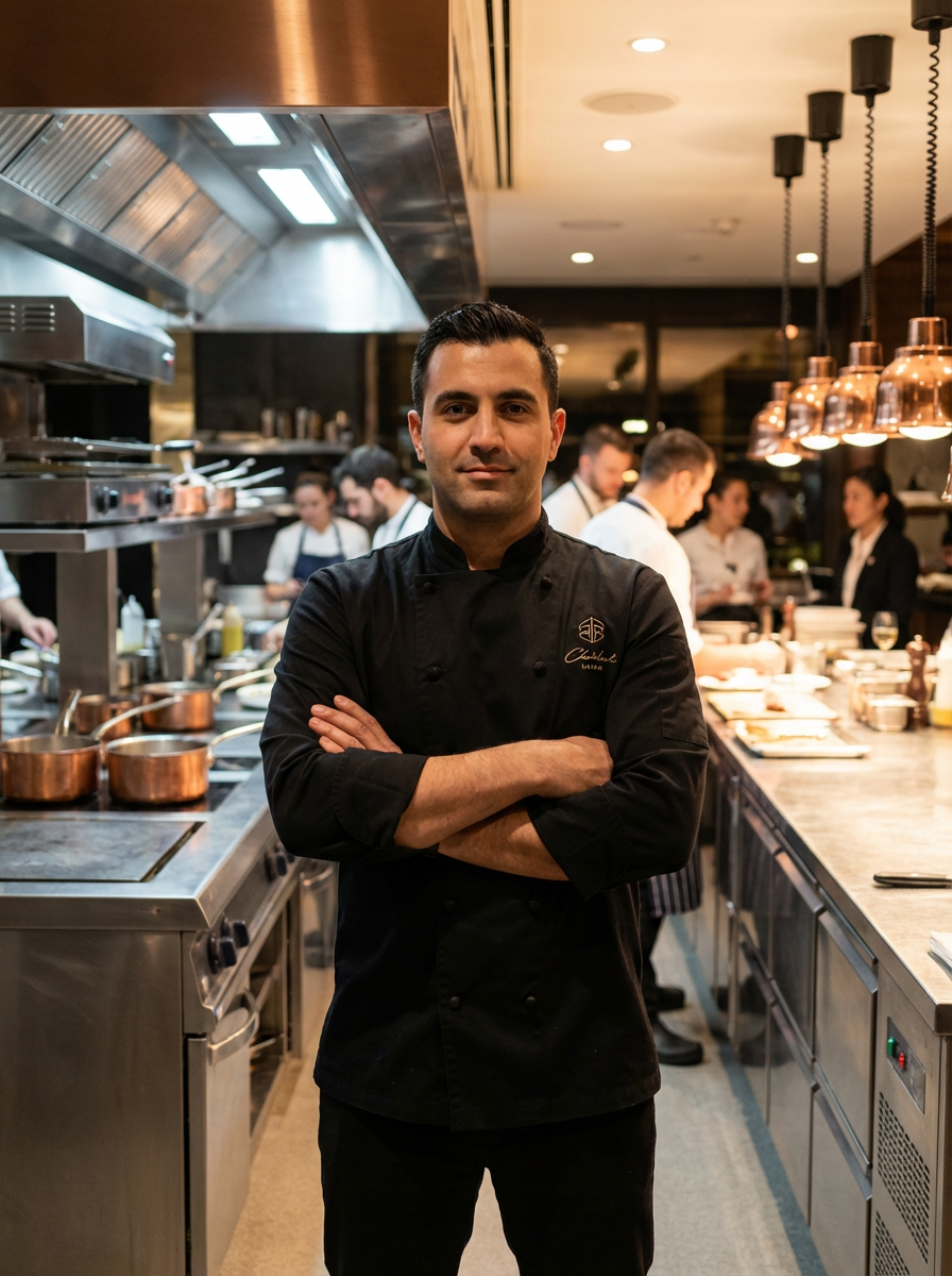 model as executive chef, black chef coat, arms crossed confident pose, upscale restaurant kitchen