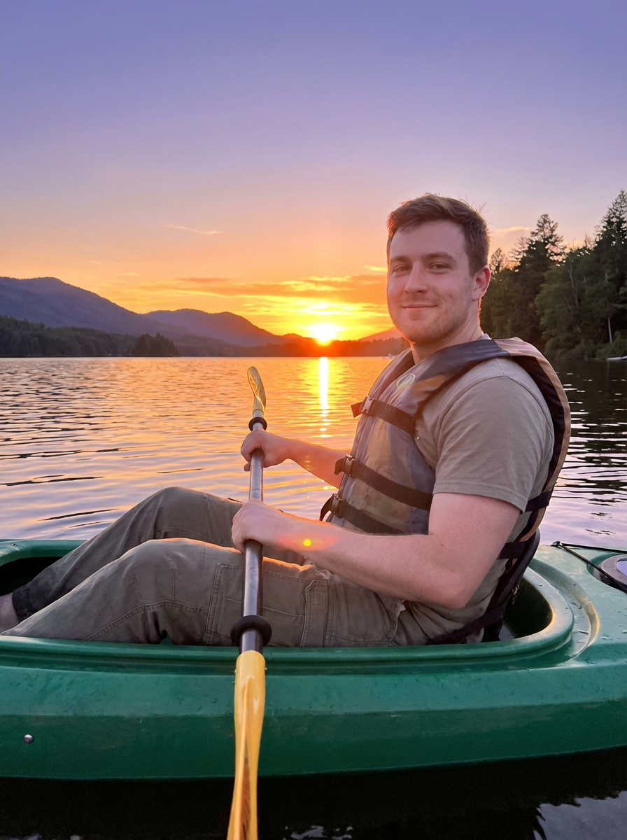 model as explorer kayaking in a serene lake with a mesmerizing sunset backdrop