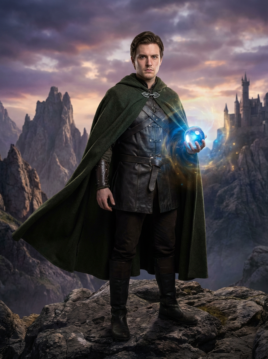 model as fantasy novel character, dramatic cape or cloak, magical lighting, epic landscape backdrop