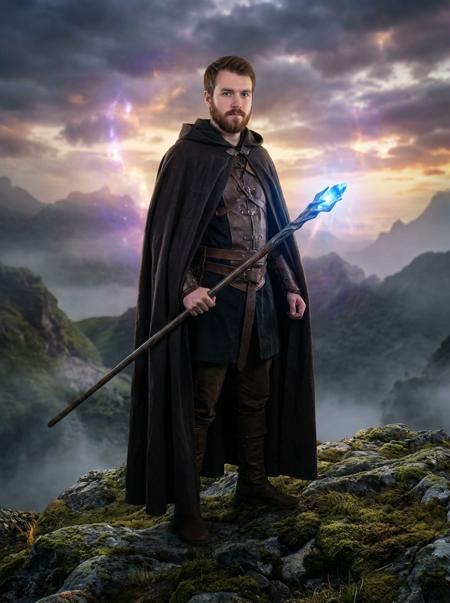 model as fantasy novel character, dramatic cape or cloak, magical lighting, epic landscape backdrop