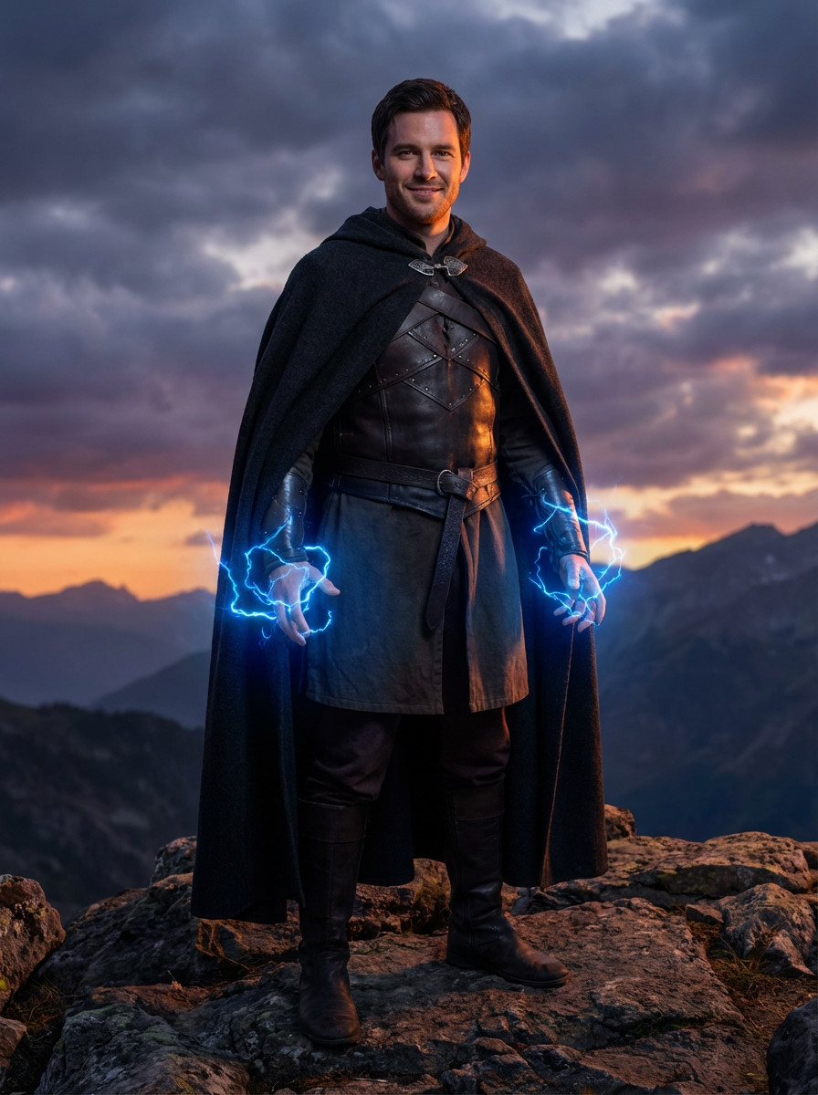 model as fantasy novel character, dramatic cape or cloak, magical lighting, epic landscape backdrop