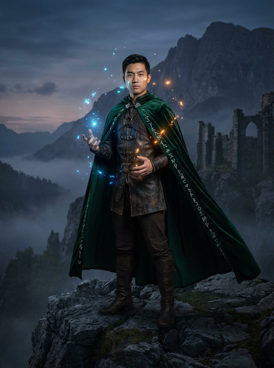 model as fantasy novel character, dramatic cape or cloak, magical lighting, epic landscape backdrop