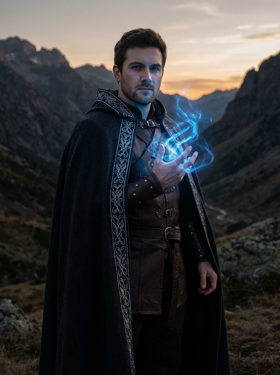 model as fantasy novel character, dramatic cape or cloak, magical lighting, epic landscape backdrop