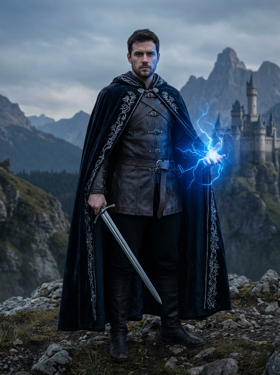 model as fantasy novel character, dramatic cape or cloak, magical lighting, epic landscape backdrop