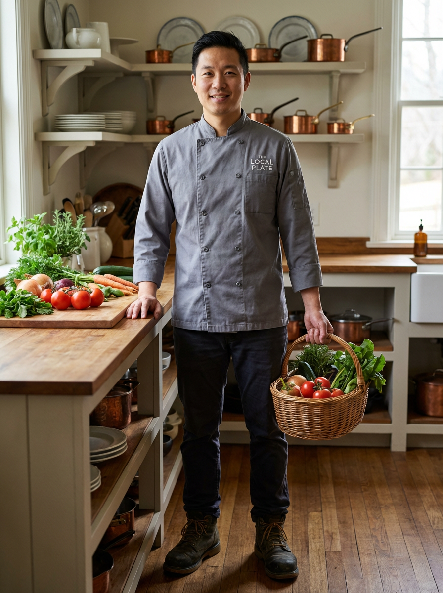 model as farm-to-table chef, casual chef coat, rustic kitchen background, fresh ingredients visible