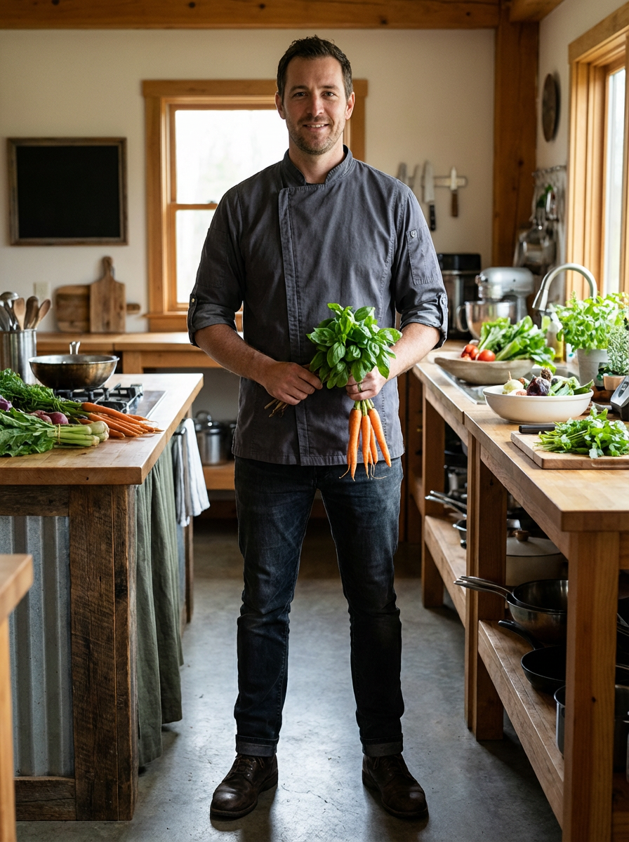 model as farm-to-table chef, casual chef coat, rustic kitchen background, fresh ingredients visible
