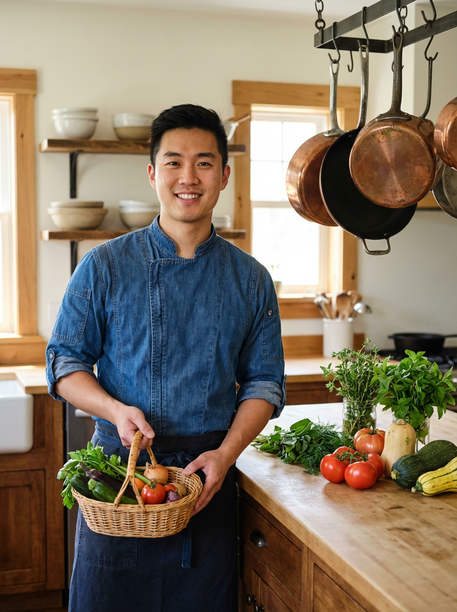 model as farm-to-table chef, casual chef coat, rustic kitchen background, fresh ingredients visible