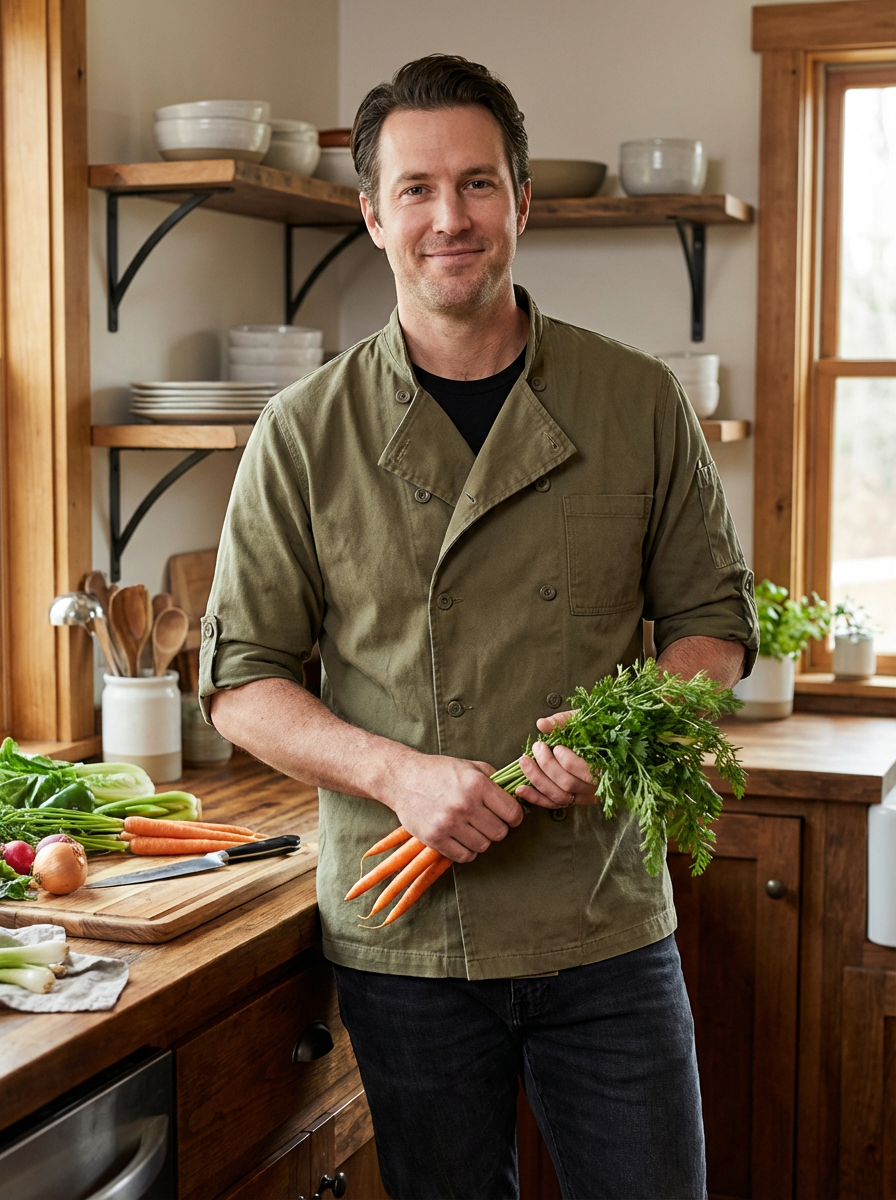 model as farm-to-table chef, casual chef coat, rustic kitchen background, fresh ingredients visible