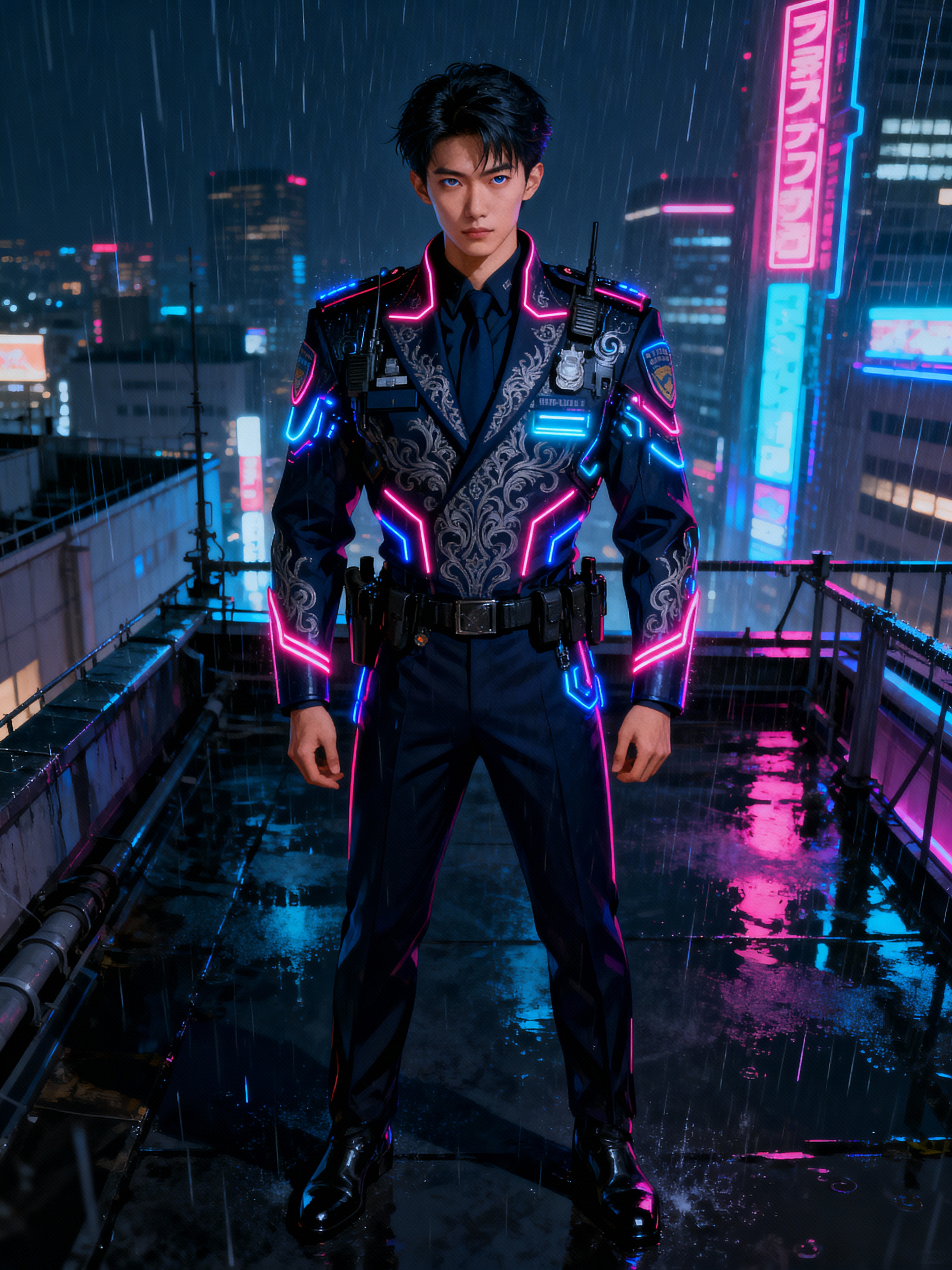 model as futuristic beautiful cyberpunk police officer, in heavy rainning futuristic tokyo rooftop cyberpunk night, ssci-fi, fantasy, intricate, very very beautiful, elegant, neon light, highly detailed, digital painting, artstation, concept art, soft light, hdri, smooth, sharp focus, illustration, art by tian zi and craig mullins and wlop and alphonse mucha