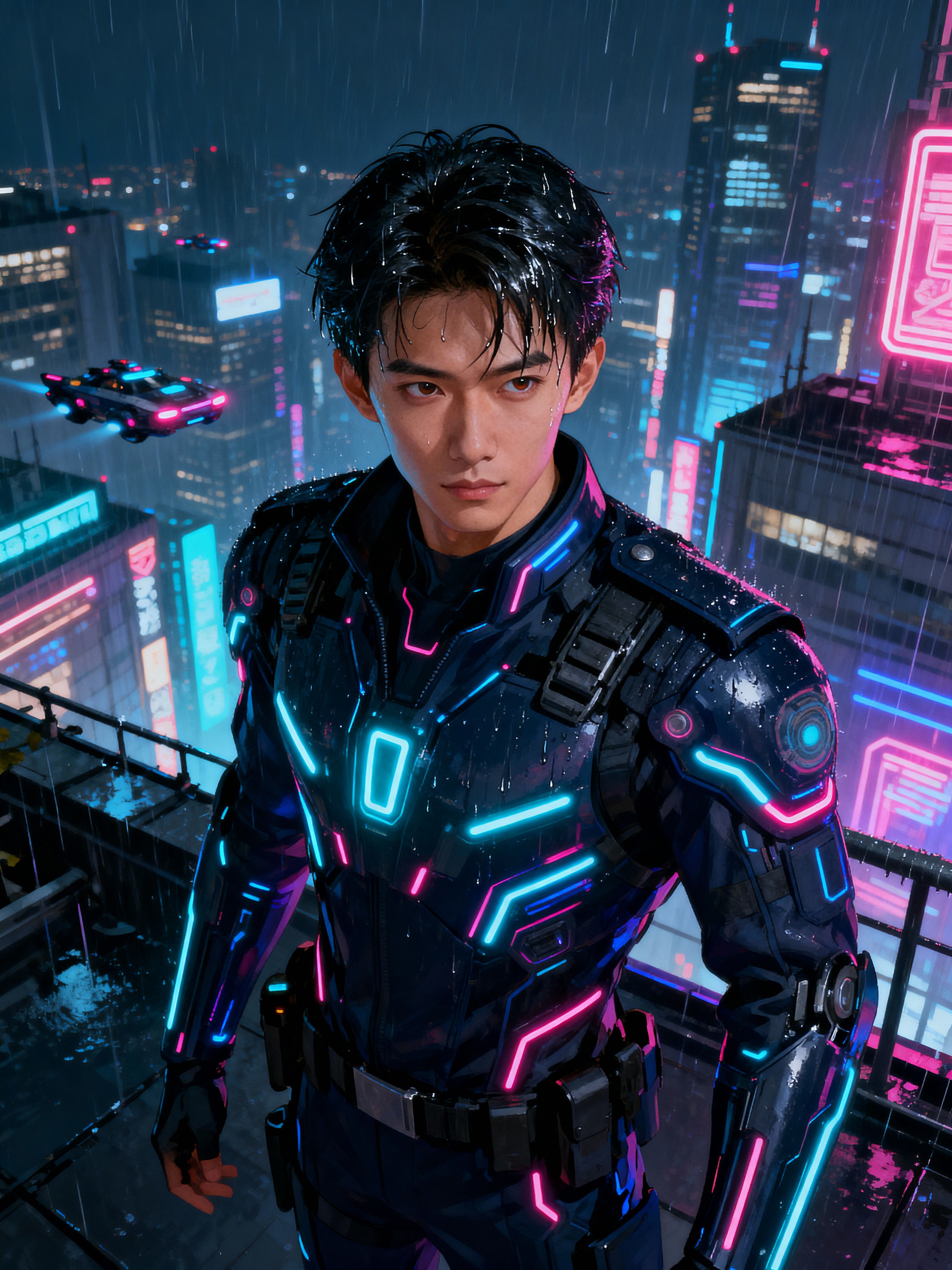 model as futuristic beautiful cyberpunk police officer, in heavy rainning futuristic tokyo rooftop cyberpunk night, ssci-fi, fantasy, intricate, very very beautiful, elegant, neon light, highly detailed, digital painting, artstation, concept art, soft light, hdri, smooth, sharp focus, illustration, art by tian zi and craig mullins and wlop and alphonse mucha