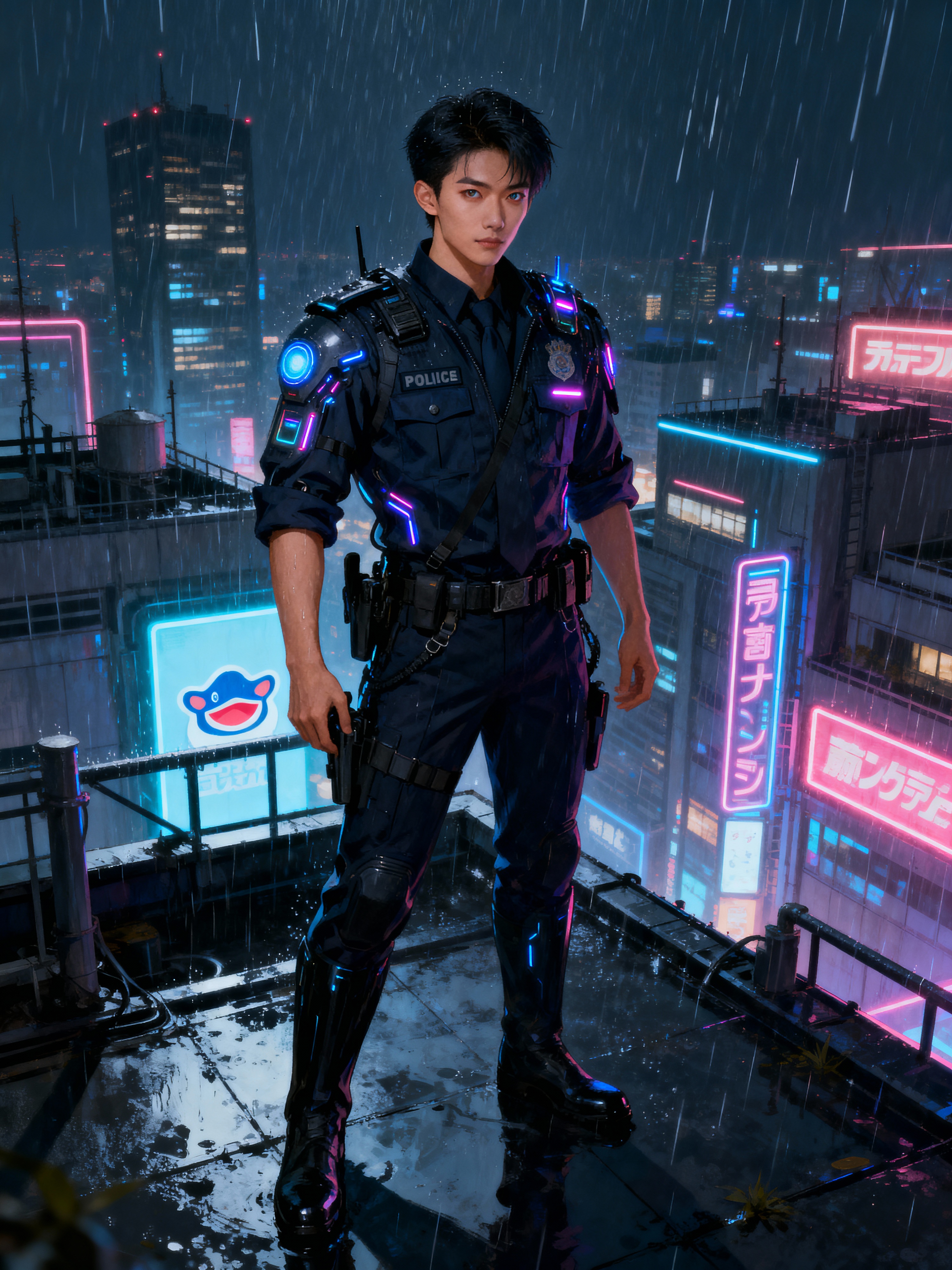 model as futuristic beautiful cyberpunk police officer, in heavy rainning futuristic tokyo rooftop cyberpunk night, ssci-fi, fantasy, intricate, very very beautiful, elegant, neon light, highly detailed, digital painting, artstation, concept art, soft light, hdri, smooth, sharp focus, illustration, art by tian zi and craig mullins and wlop and alphonse mucha