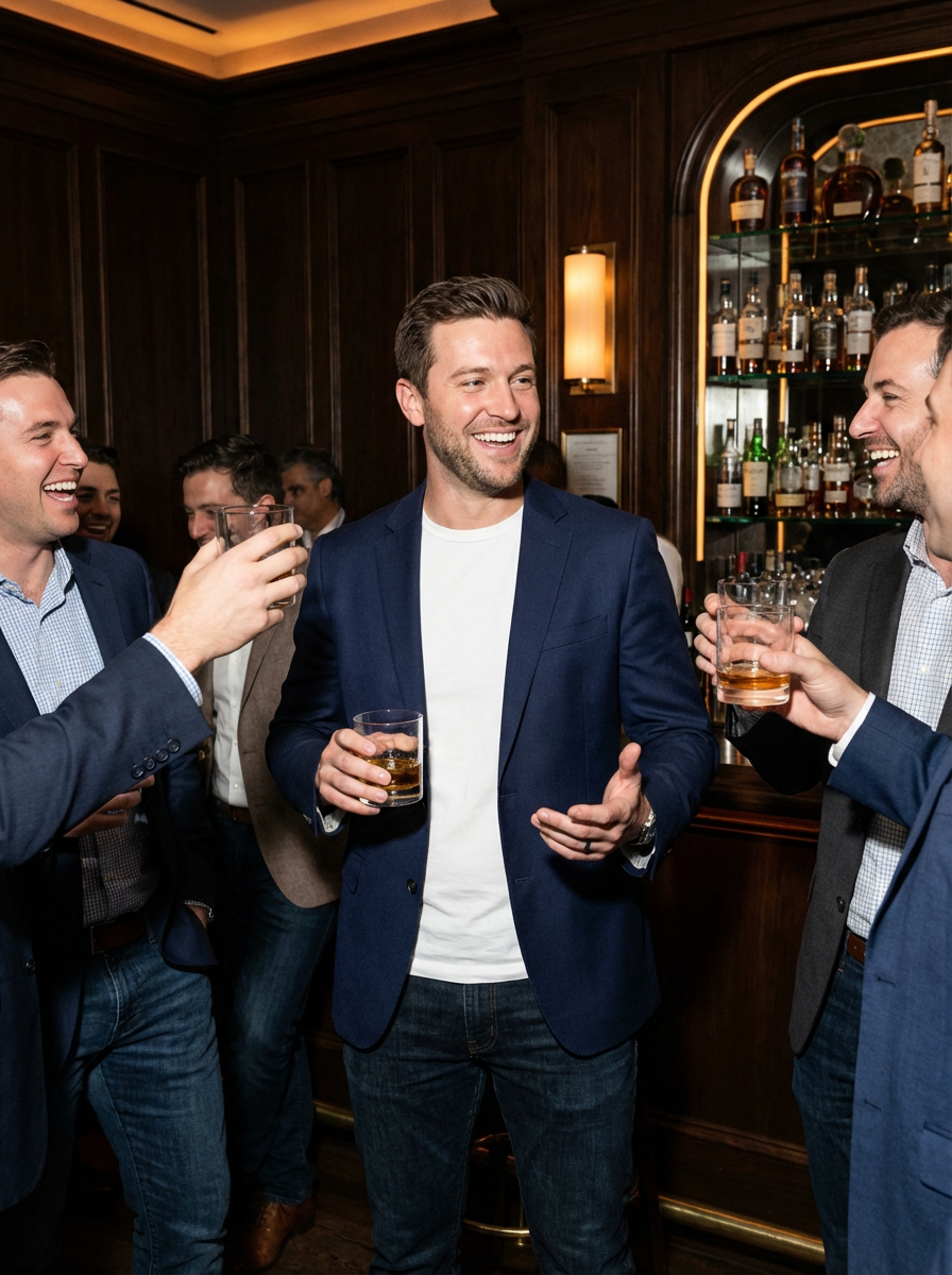 model as groom-to-be at bachelor party, stylish casual outfit, surrounded by friends, upscale bar or lounge setting, celebratory vibe