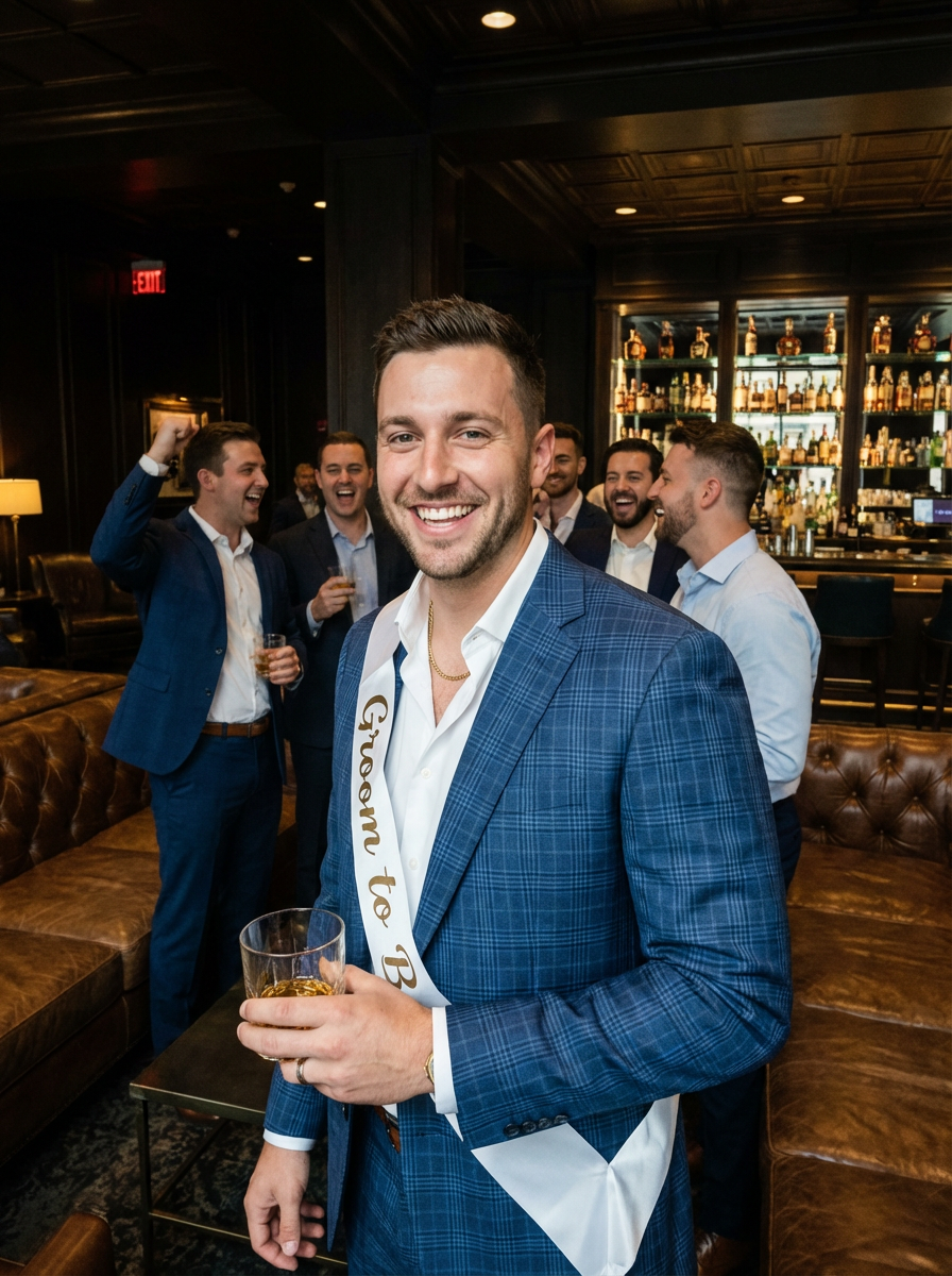 model as groom-to-be at bachelor party, stylish casual outfit, surrounded by friends, upscale bar or lounge setting, celebratory vibe