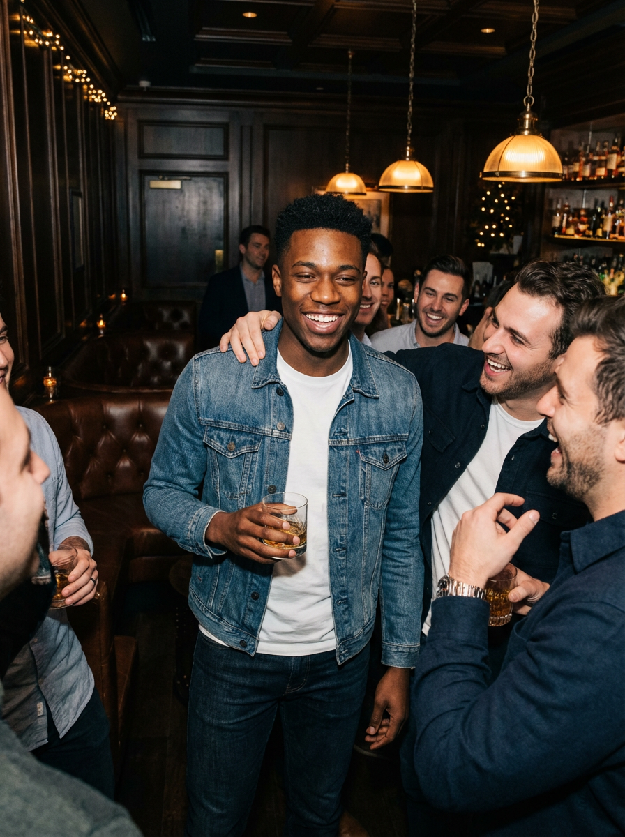 model as groom-to-be at bachelor party, stylish casual outfit, surrounded by friends, upscale bar or lounge setting, celebratory vibe