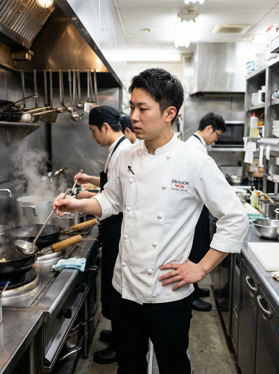 model as head chef, professional double-breasted chef coat, commanding presence, busy kitchen background
