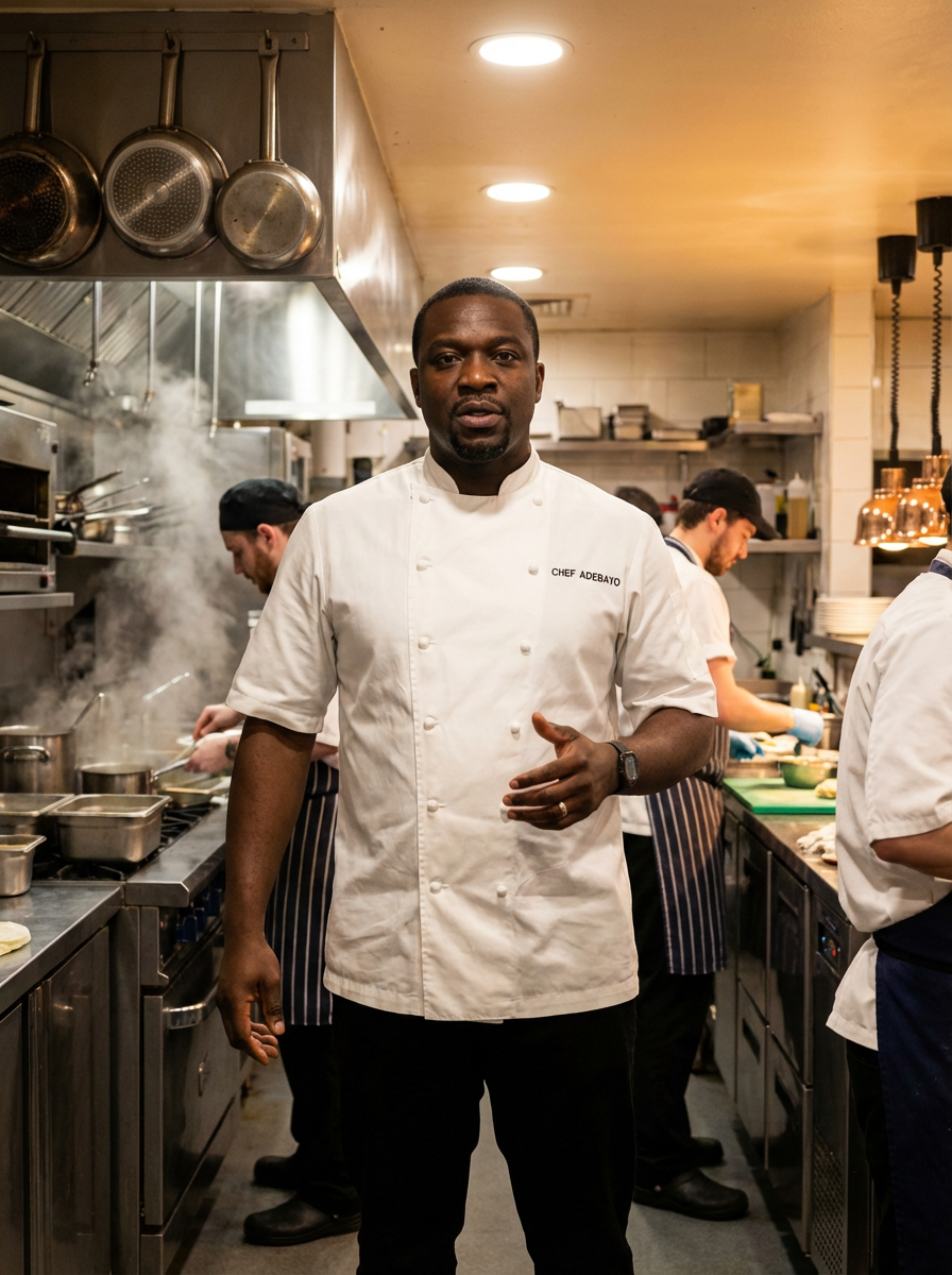 model as head chef, professional double-breasted chef coat, commanding presence, busy kitchen background