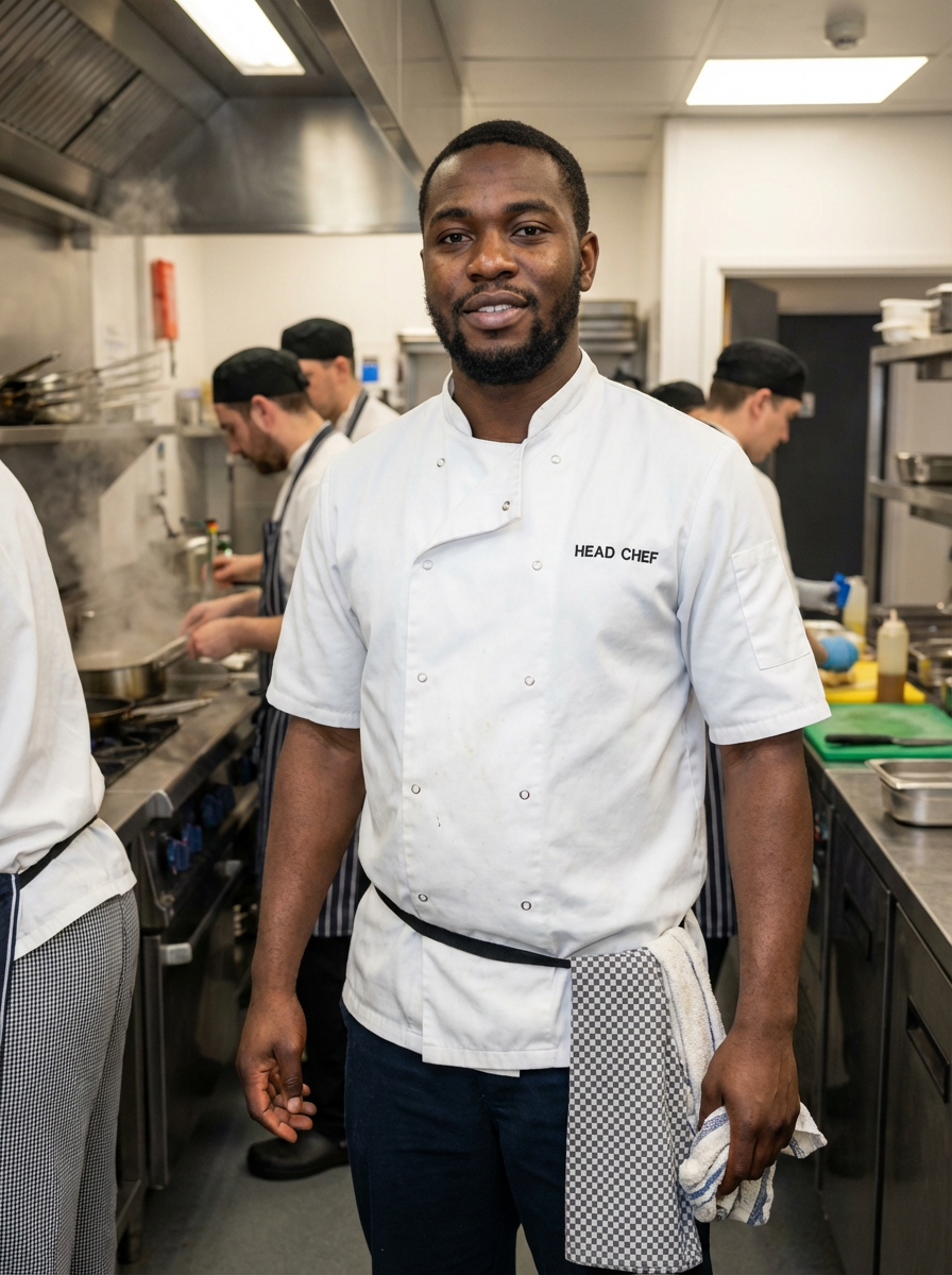 model as head chef, professional double-breasted chef coat, commanding presence, busy kitchen background