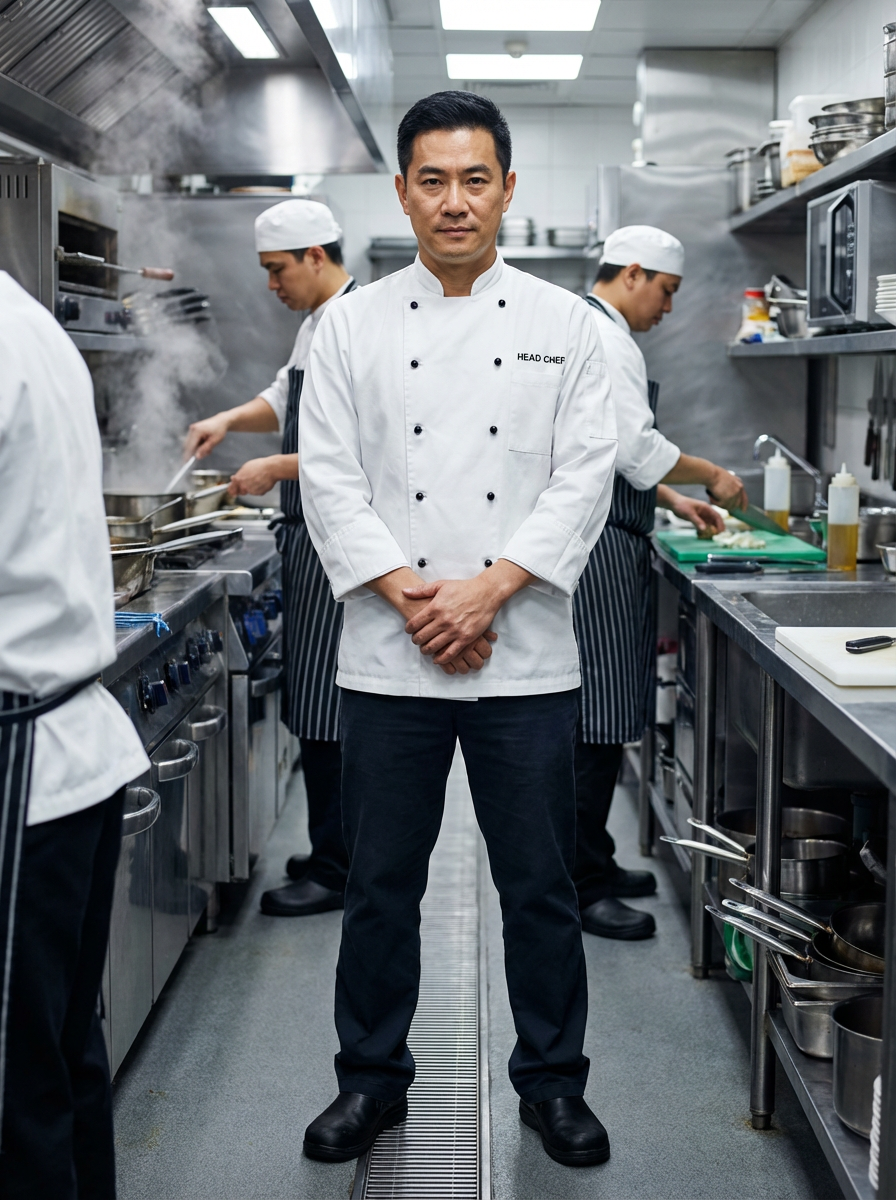 model as head chef, professional double-breasted chef coat, commanding presence, busy kitchen background