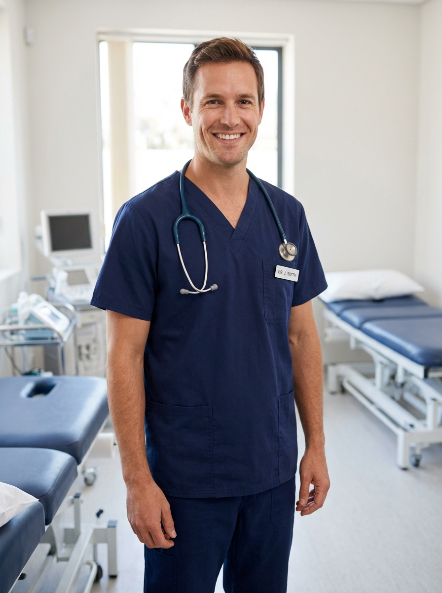 model as healthcare professional, neat scrubs in navy blue, warm genuine smile, clinical setting