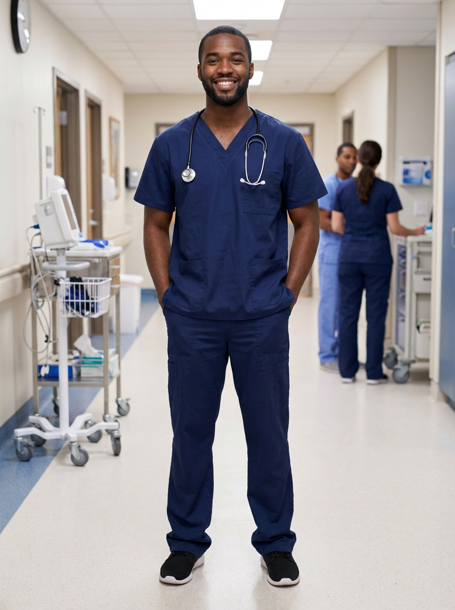 model as healthcare professional, neat scrubs in navy blue, warm genuine smile, clinical setting