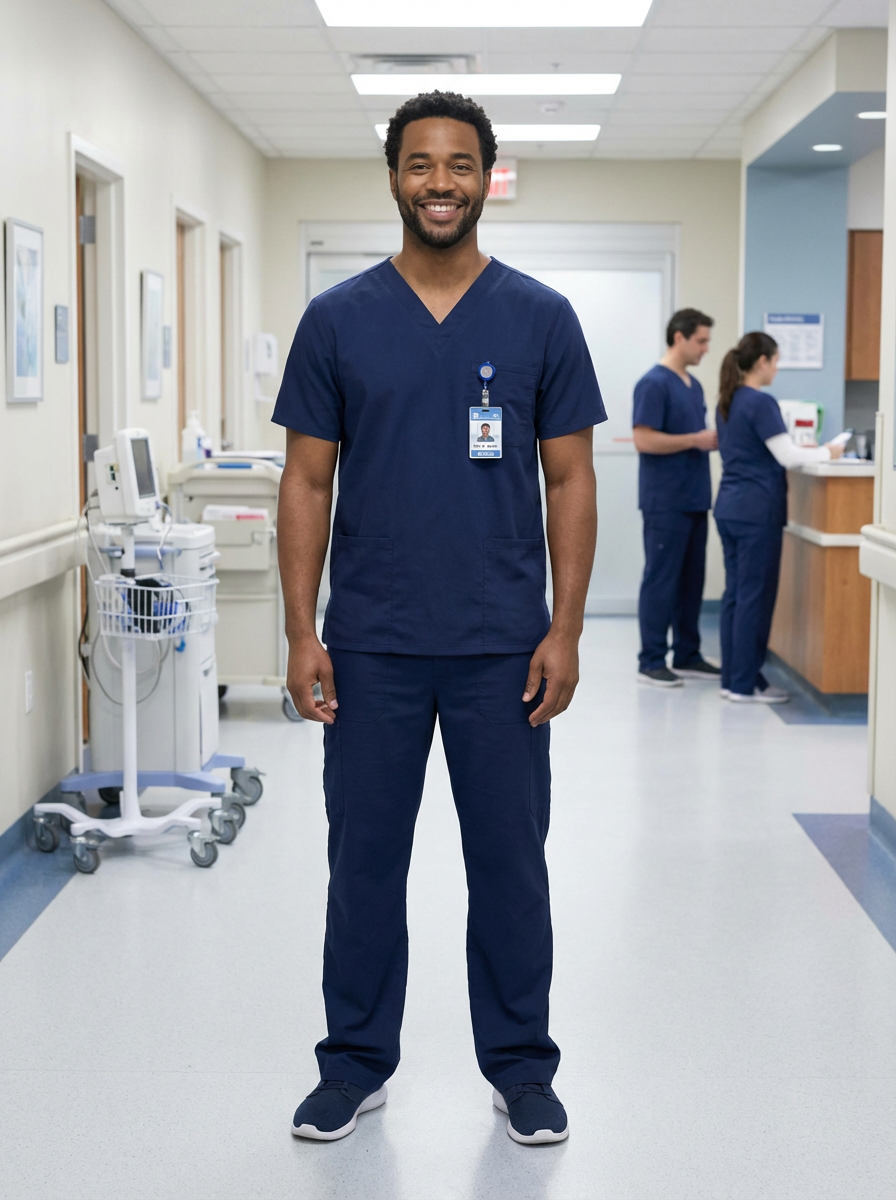 model as healthcare professional, neat scrubs in navy blue, warm genuine smile, clinical setting