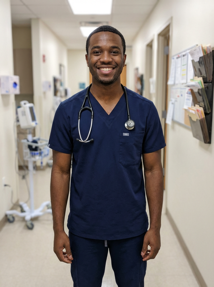 model as healthcare professional, neat scrubs in navy blue, warm genuine smile, clinical setting