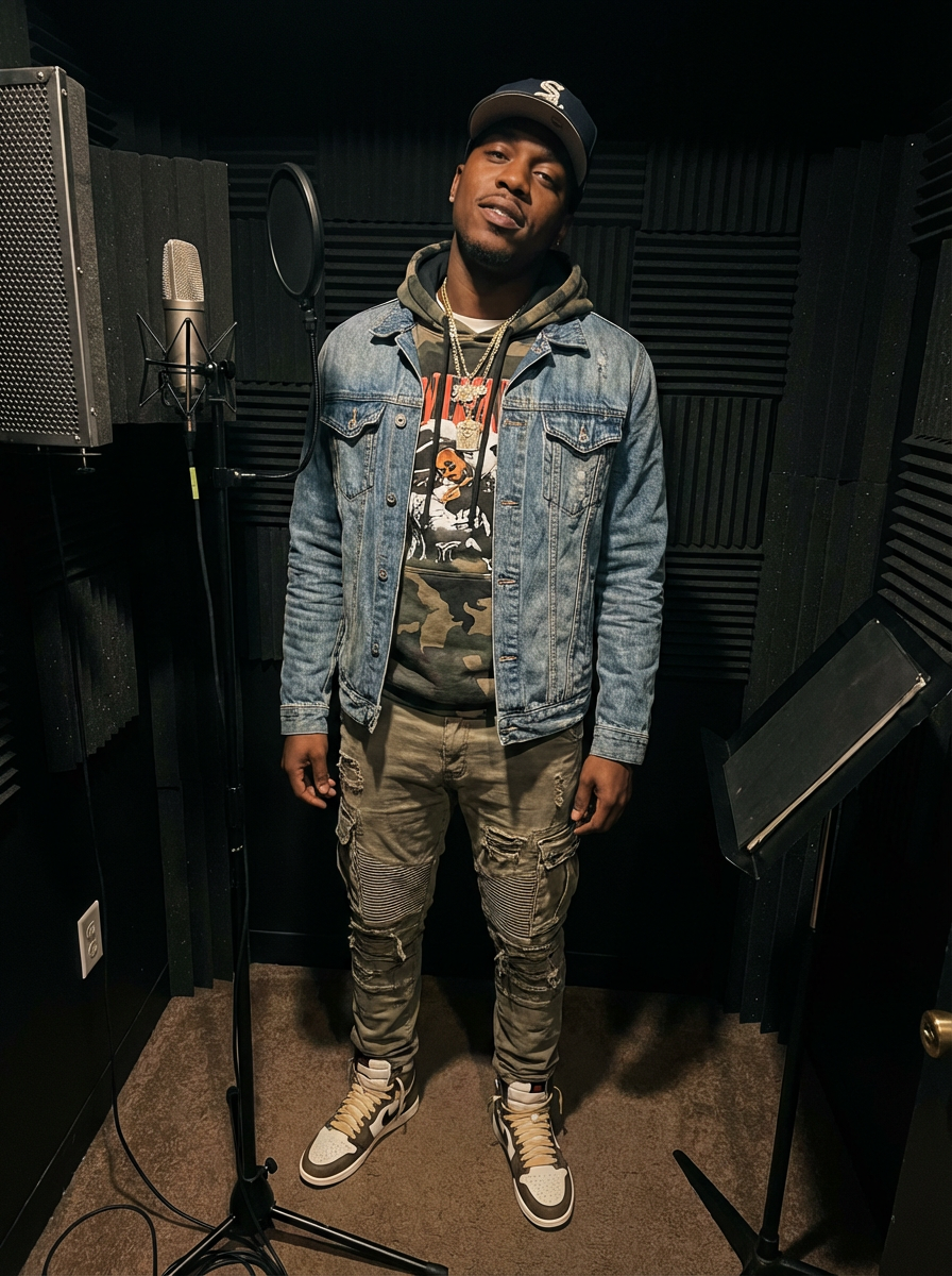 model as hip hop artist, urban stylish attire, confident swagger, studio booth background