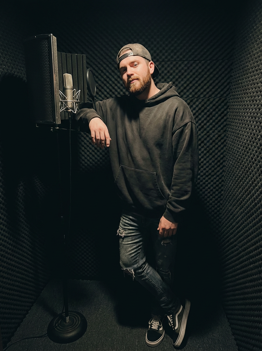 model as hip hop artist, urban stylish attire, confident swagger, studio booth background