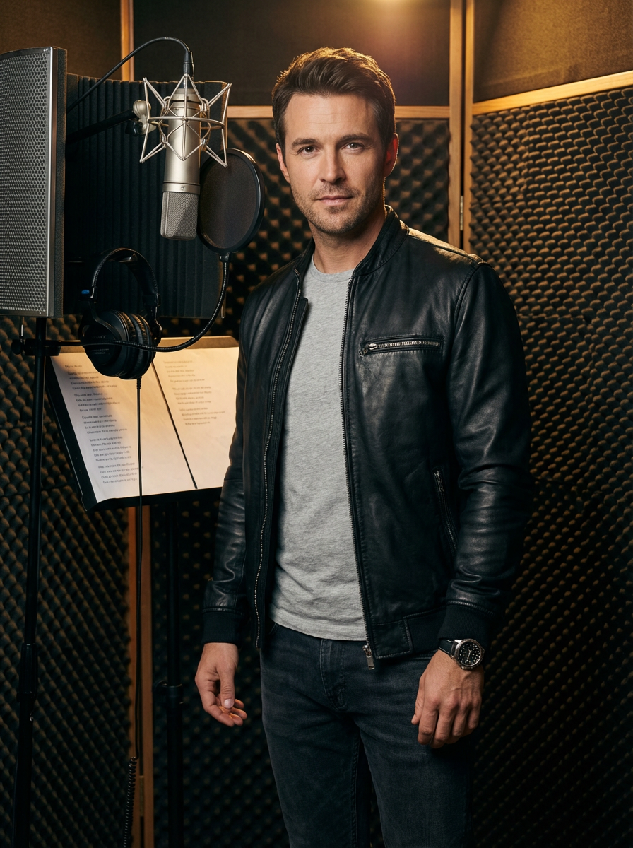 model as hip hop artist, urban stylish attire, confident swagger, studio booth background