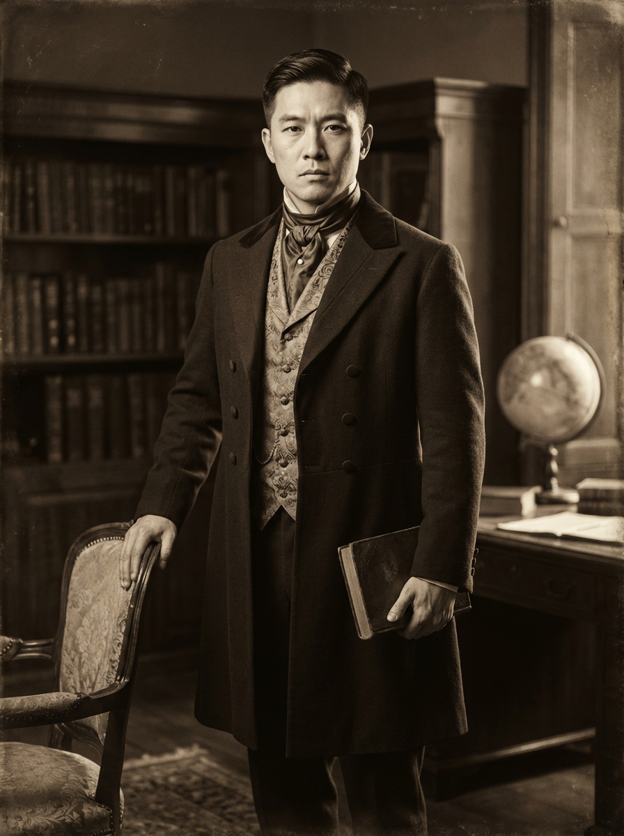 model as historical fiction character, period-appropriate styling, vintage aesthetic, dramatic composition