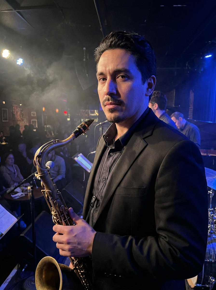 model as jazz musician, sophisticated cool aesthetic, smoky club atmosphere, blue mood lighting