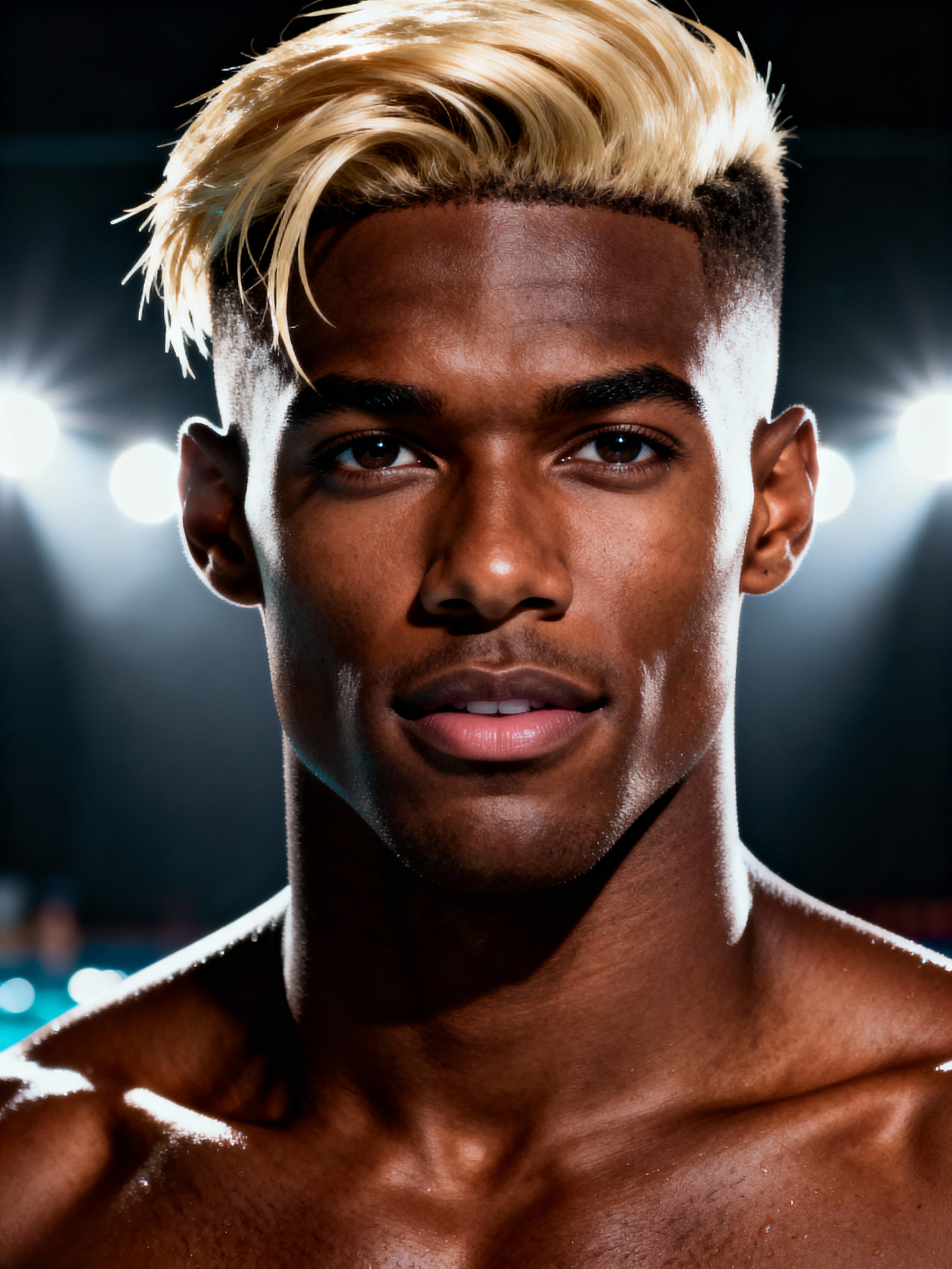 model as Ken from Barbie with swim trunks, shirtless, undercut blonde hairstyle.