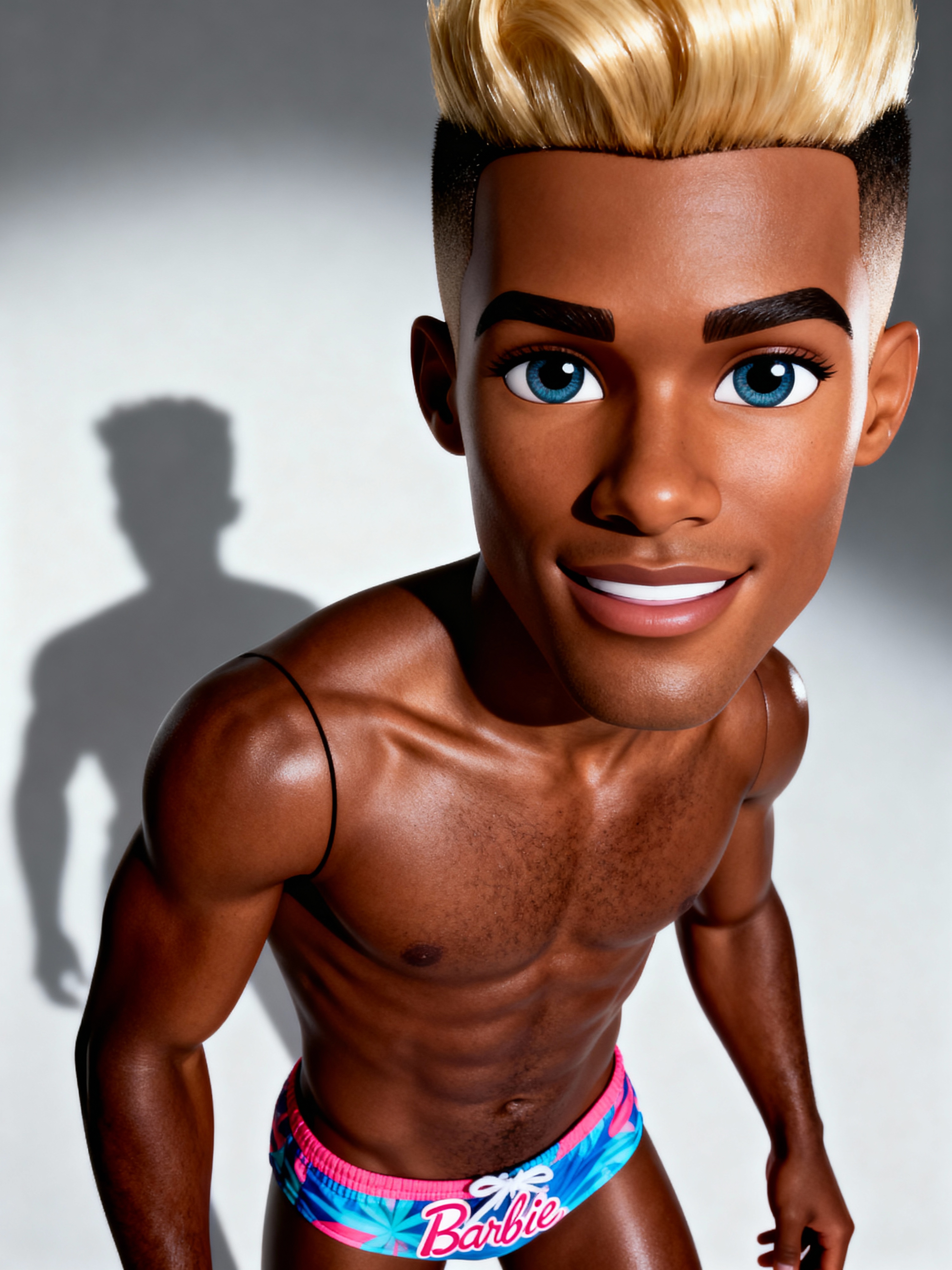 model as Ken from Barbie with swim trunks, shirtless, undercut blonde hairstyle.