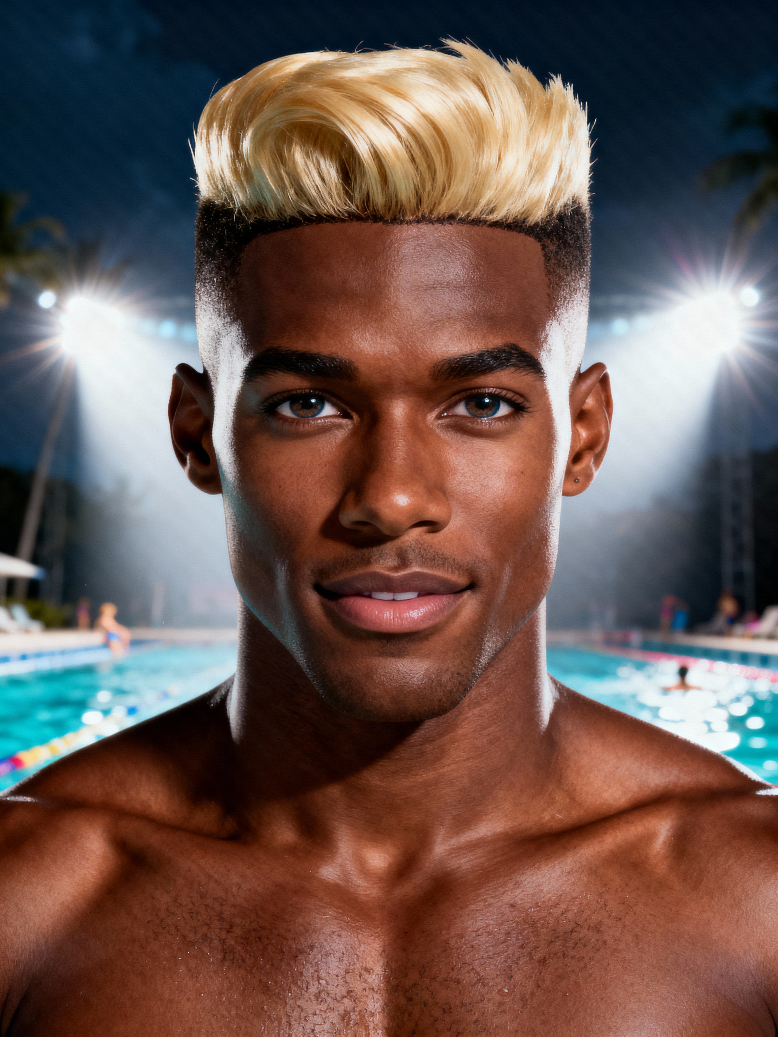 model as Ken from Barbie with swim trunks, shirtless, undercut blonde hairstyle.