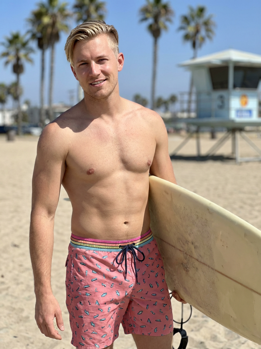 model as Ken from Barbie with swim trunks, shirtless, undercut blonde hairstyle.