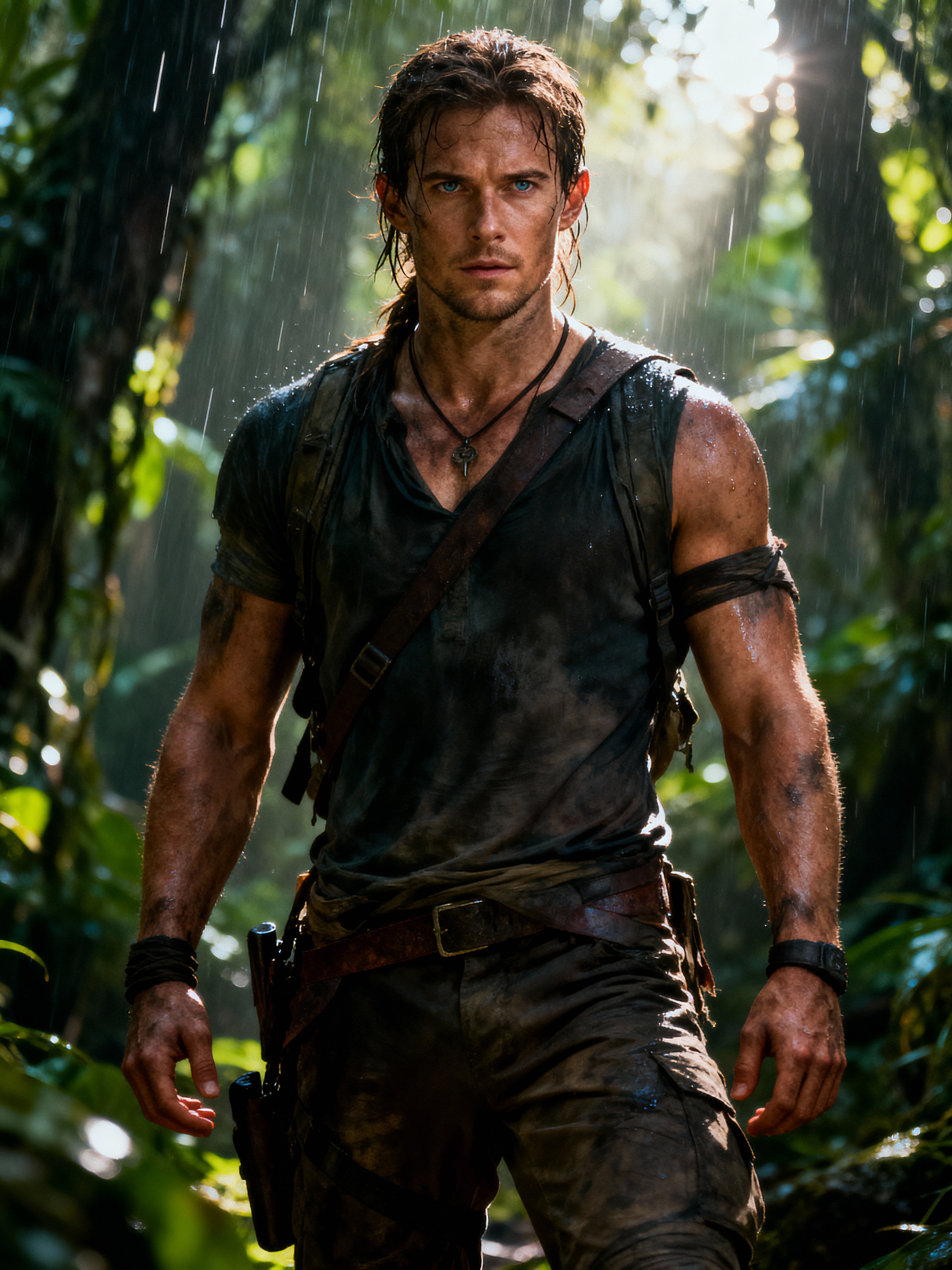 model as masculine male sidekick of Lara Croft in Tombraider, in rainforest, cinematic lighting